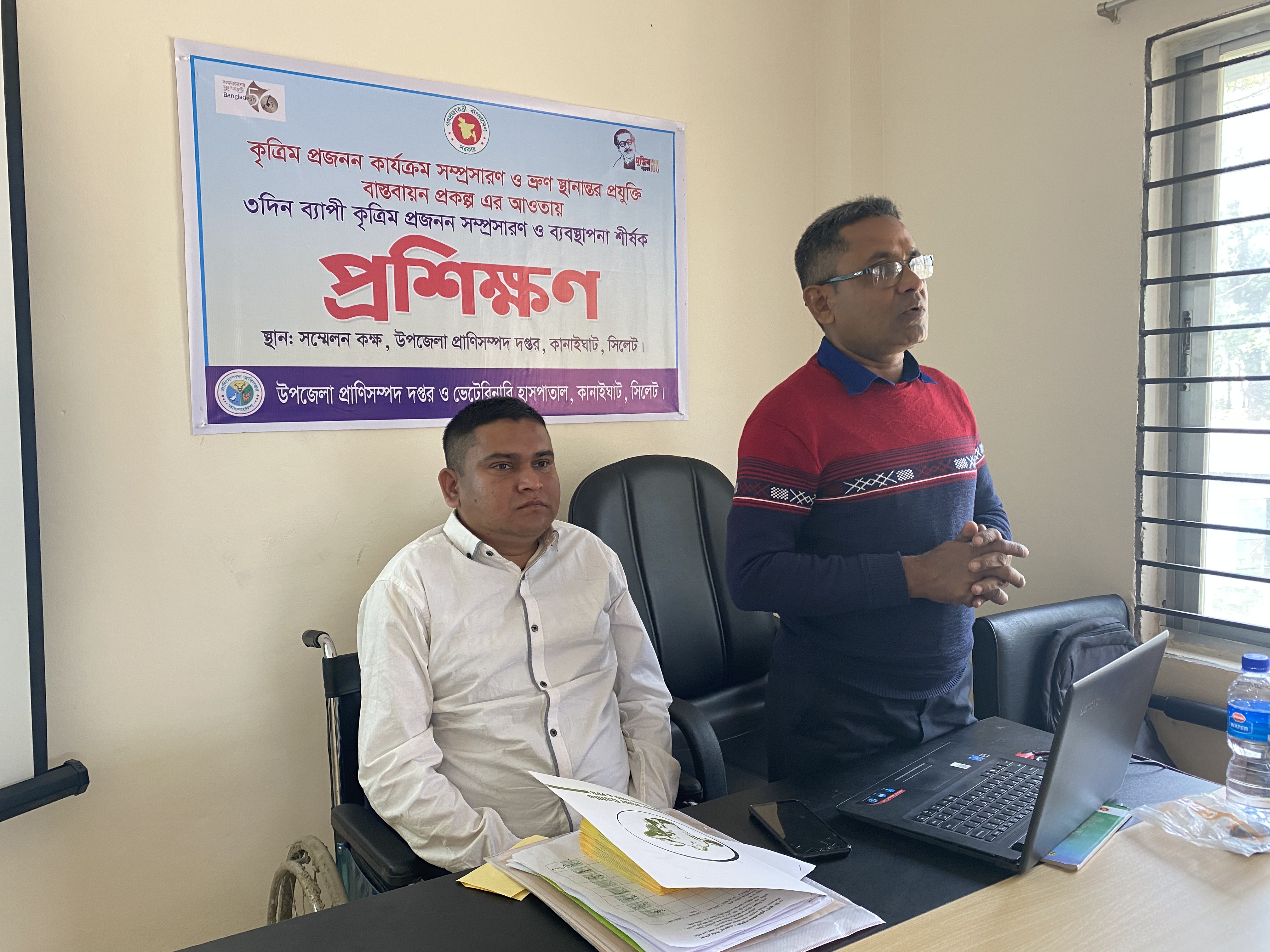 কৃত্রিম প্রজনন কার্যক্রম সম্প্রসারণ ও ভ্রণ স্থানান্তর প্রযুক্তি বাস্তবায়ন প্রকল্প এর আওতায় ০৩ দিন ব্যাপী কৃত্রিম প্রজনন সম্প্রসারণ ও ব্যবস্থাপনা শীর্ষক প্রশিক্ষণ স্থান ;সম্মেলন কক্ষ, উপজেলা প্রাণিসম্পদ দপ্তর, কানাইঘাট, সিলেট। বাস্তবায়নে ; উপজেলা প্রাণিসম্পদ দপ্তর ও ভেটেরিনারি হাসপাতাল, কানাইঘাট, সিলেট।